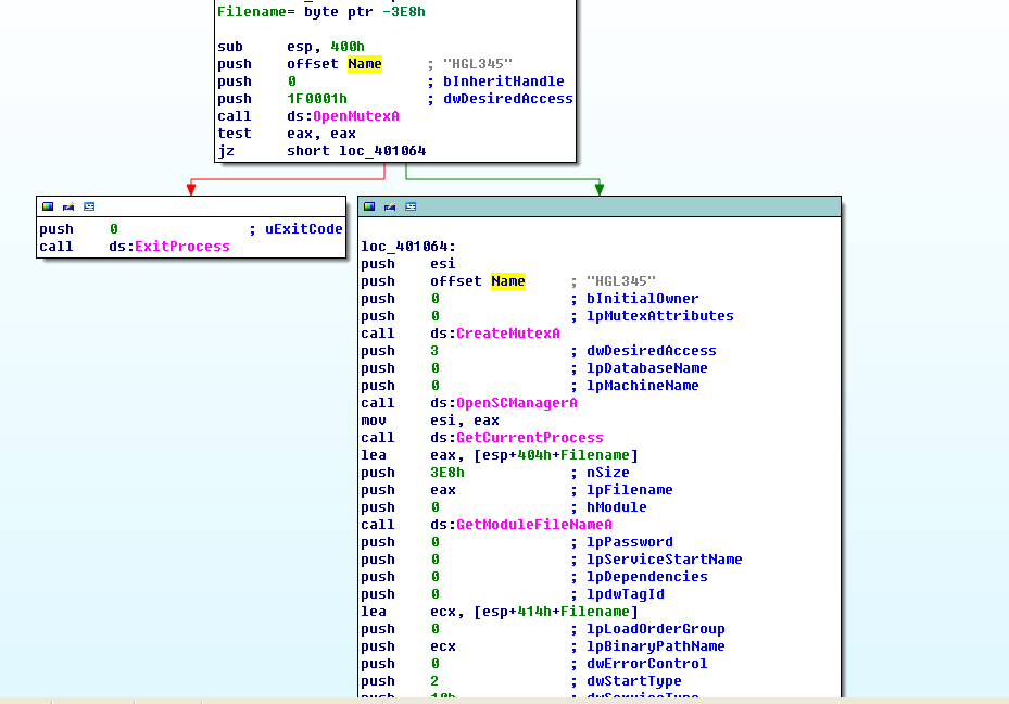 首先是openmutex检查互斥量HGL345是否存在,存在这说明已经有一个恶意程序在运行了,所以就直接就结束程序,如果不存在则createmutex创建这个互斥量