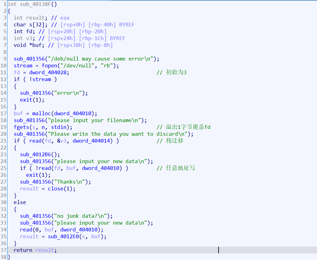 栈溢出1字节修改fd为1,得到2个标准输入,布置栈迁移覆盖buf到0x3fe000,任意地址写shellcode到buf里,mprotect更改可执行